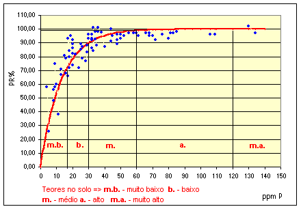 Tomando-se como base as produções relativas de 70%, 90% e 98%, obteve-se através da equação de Mitscherlich os limites superiores das Classes de fertilizante "muito baixa", "baixa" e "média". Duplicando-se o valor deste último, tem-se o extremo superior da classe "alta". Teores localizáveis acima deste são considerados como "muito alto".