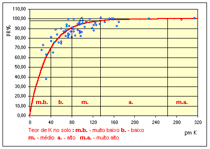 O nível crítico (90% da produção relativa) para o fósforo estabelecido no presente trabalho, foi de 30 ppm, enquanto que para o potássio foi 80 ppm. Comparando-se tais valores com os que foram obtidos anteriormente com parte dos dados experimentais (16 e 12) observa-se que, enquanto não houve alteração significativa para o fósforo, cujo nível anterior era 33 ppm, o nível crítico para o potássio diminui de 91 ppm para 80 ppm. Tal fato se explica pela inclusão de novos pontos experimentais correspondentes principalmente à classe "muito baixa".